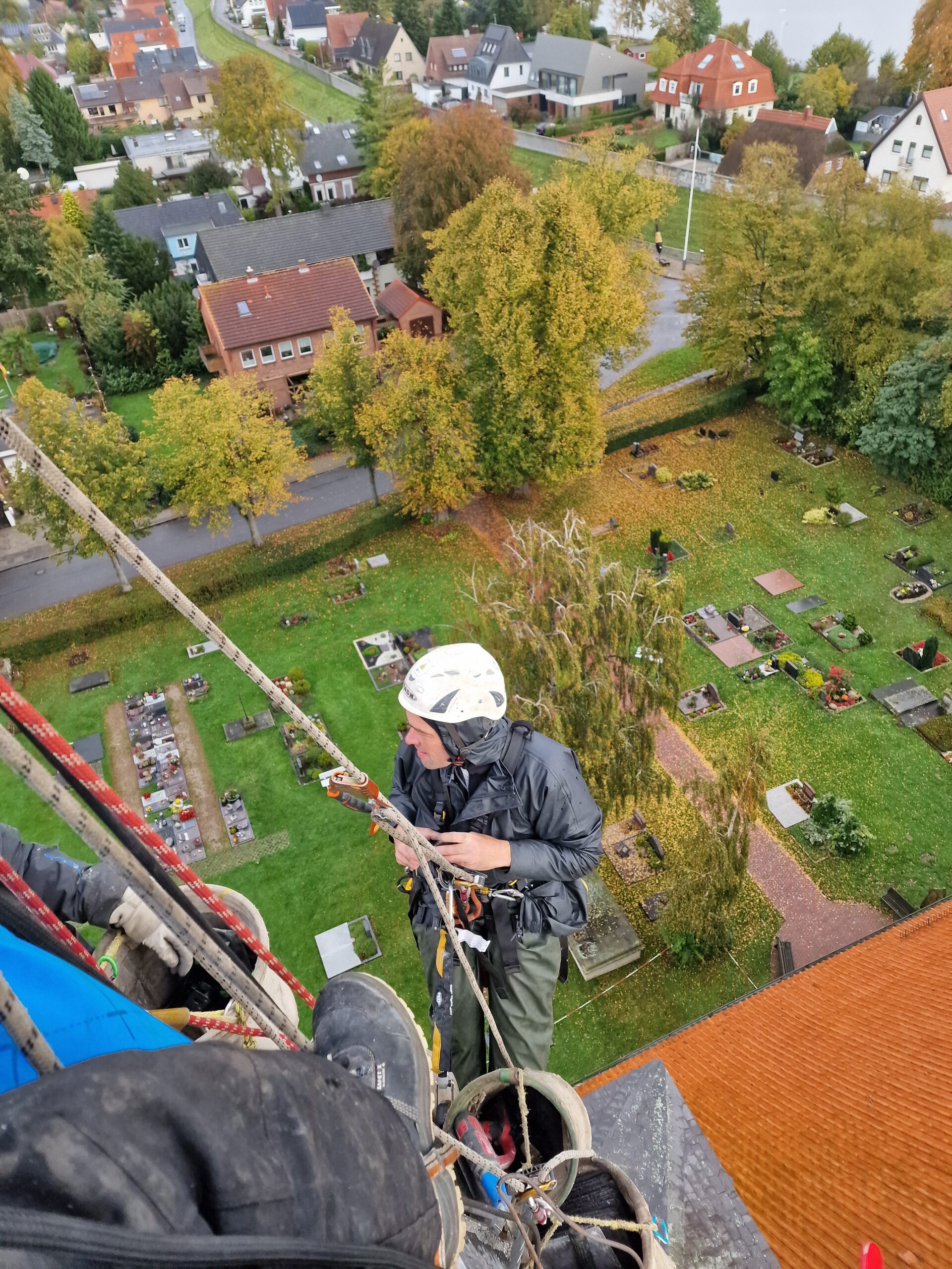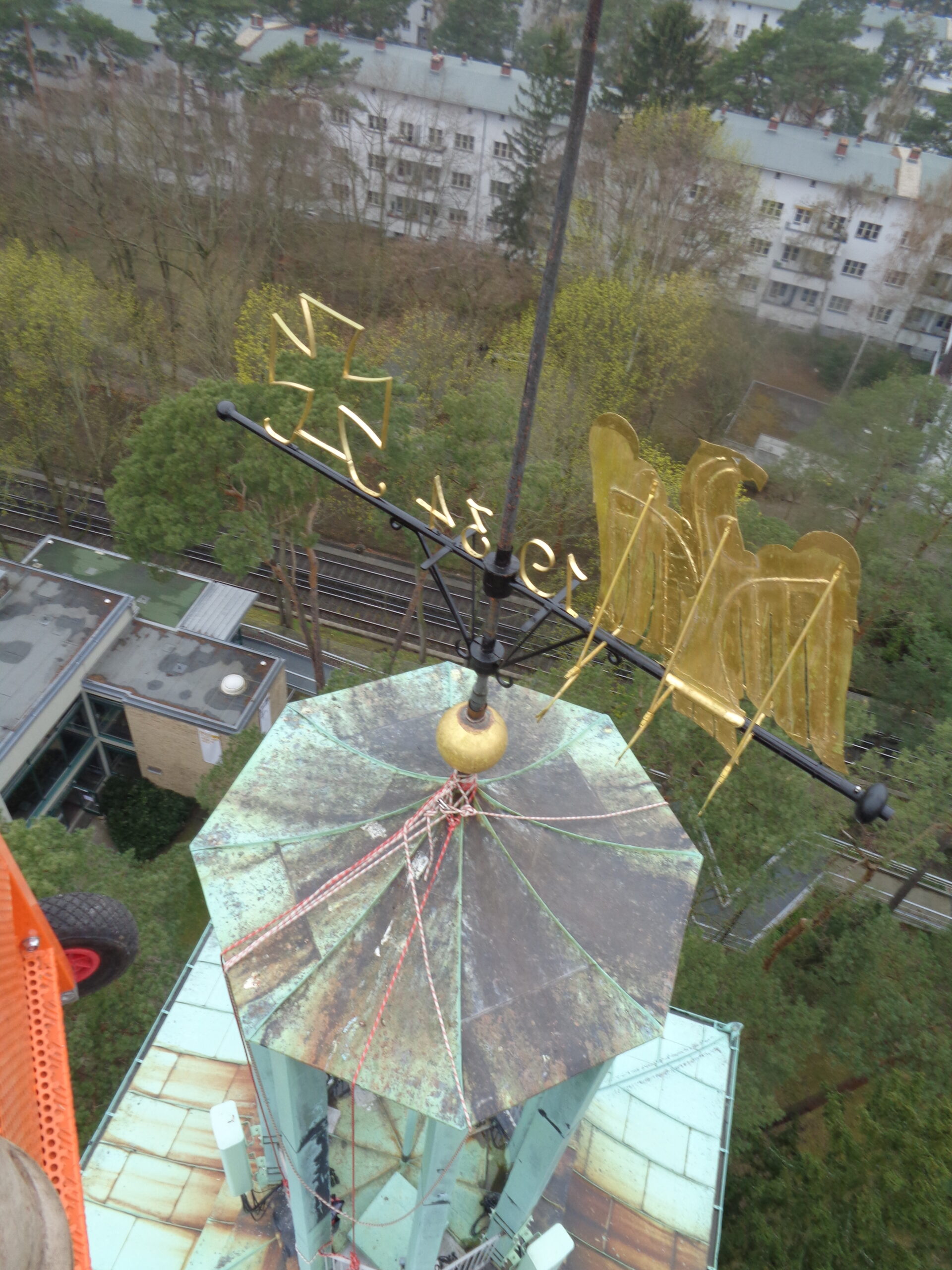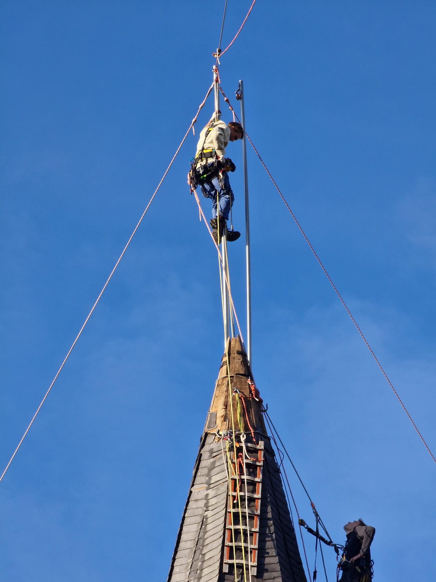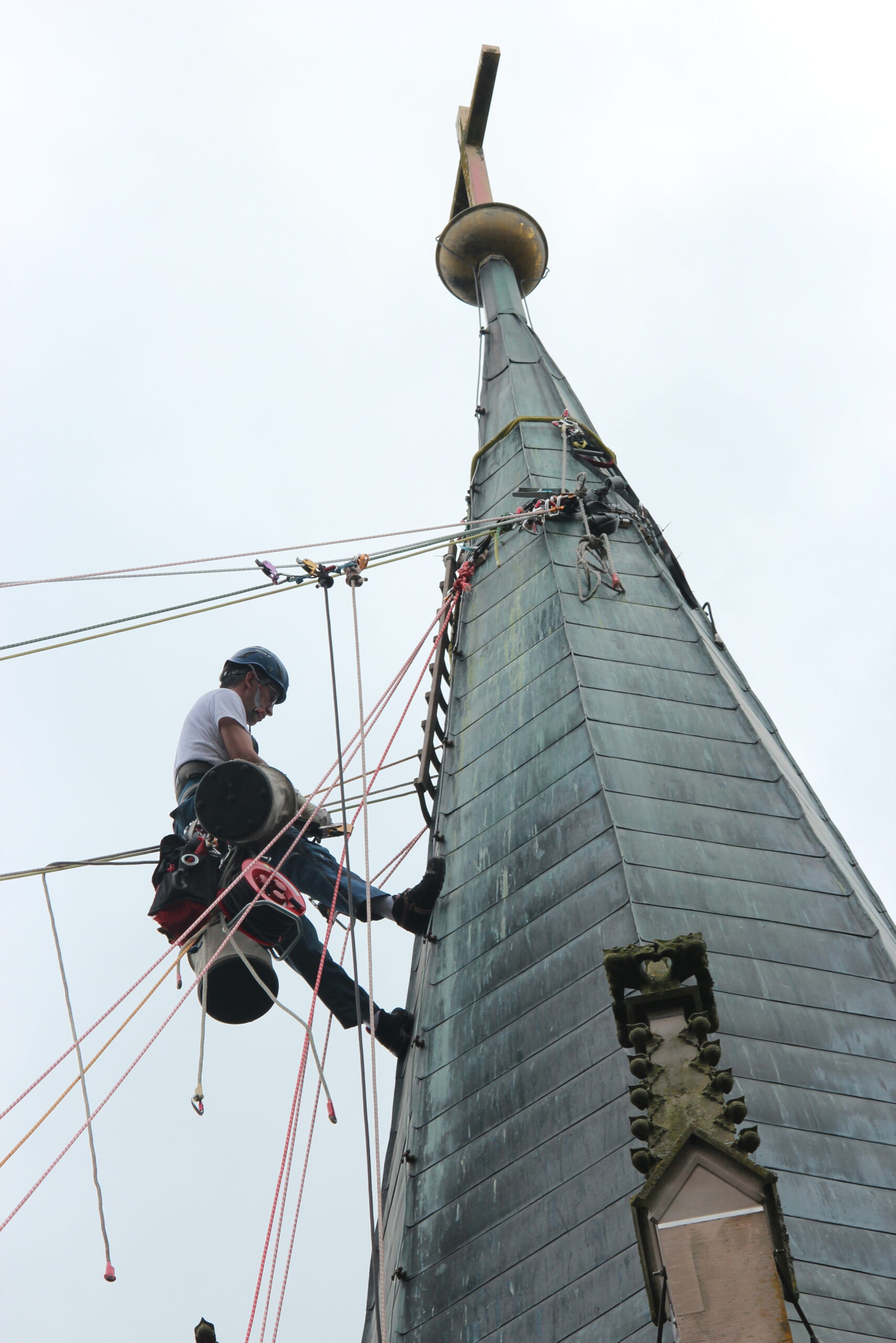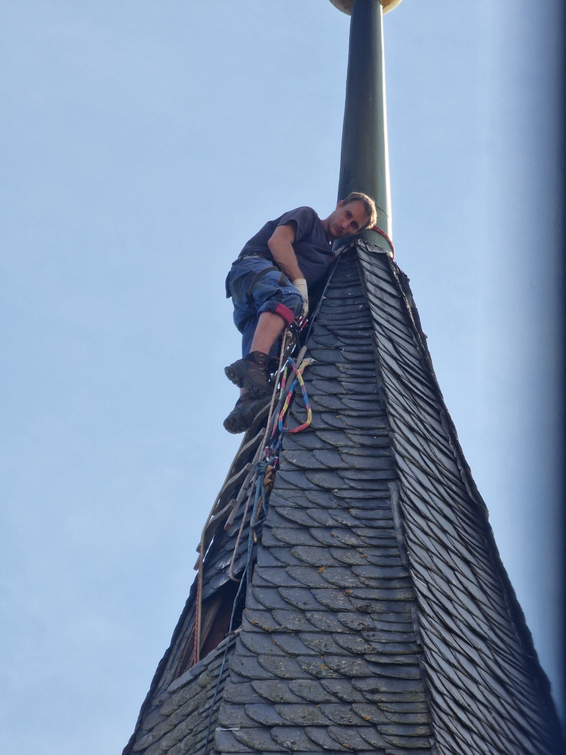 Unsere entwickelte Turmspitzenplattform „TSP“ kann von FISAT‑ und IRATA‑zertifizierten Kletterern, Dachdeckern und Dachspenglern auf allen Turmspitzen errichtet werden. Auf der mobilen Konstruktion ist eine Kranvorrichtung angebracht, mit der selbst schwere Eisenpfeiler, Turmkreuze, Wetterhähne, Fahnen und Kaiserstiele sicher entnommen und nach Neuanfertigung wieder eingebaut werden können. So wird die Sanierung von Turmkreuzen nicht nur präzise, sondern nachhaltig umgesetzt. Schließlich profitieren Auftraggeber von einer Kombination aus handwerklicher Erfahrung, moderner Technik und international anerkannten Sicherheitsstandards.